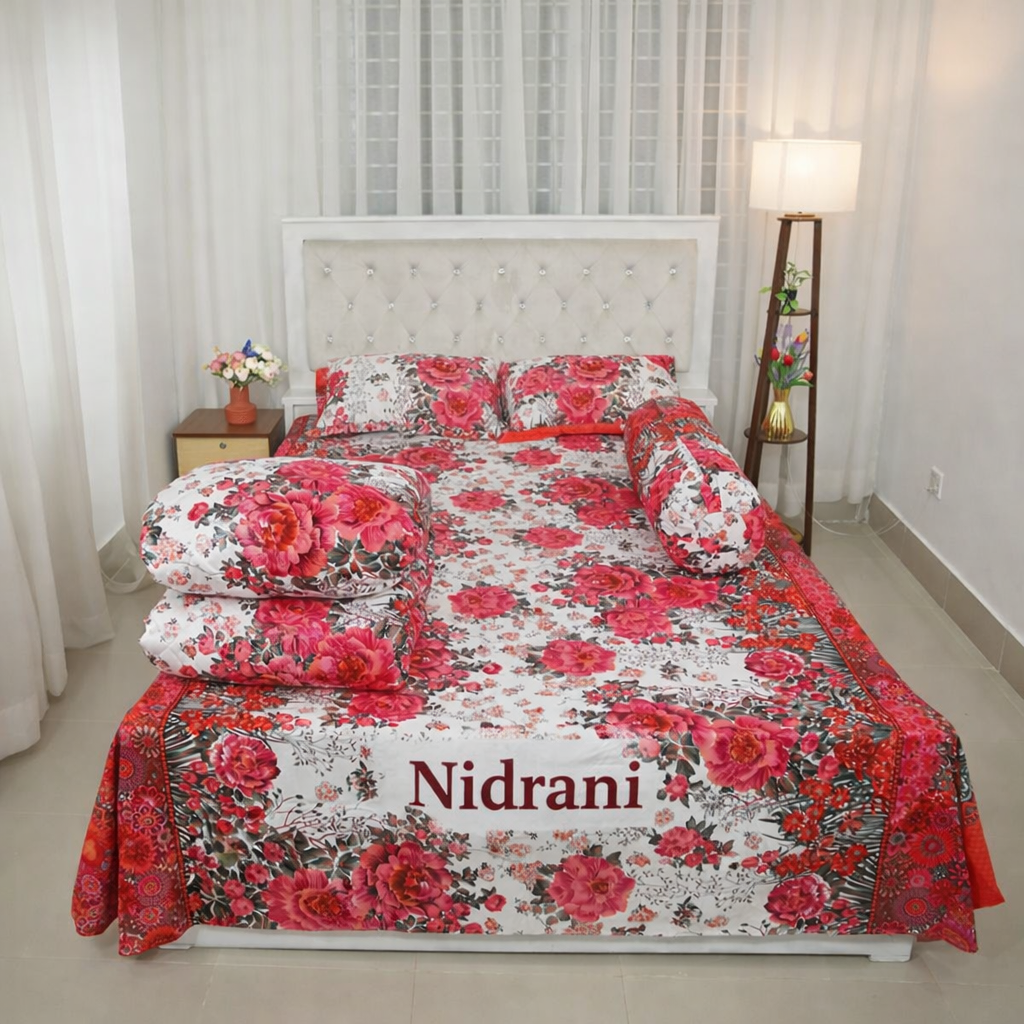 🌹 নিদ্রানী শুভ্র গোলাপ টুয়িল বেডশিট সাদা ক্যানভাসে রক্তিম গোলাপের আভিজাত্য আপনার বেডরুমকে একটি জীবন্ত পুষ্পকাননে রূপান্তর করতে Nidrani নিয়ে এলো শুভ্র গোলাপ টুয়িল বেডশিট। ধবধবে সাদা (Pure White) ব্যাকগ্রাউন্ডের ওপর বড় বড় লাল ও গোলাপি গোলাপের এই ডাচ-ফ্লোরাল ডিজাইনটি আপনার ঘরে নিয়ে আসবে এক অদ্ভুত প্রশান্তি এবং আভিজাত্য। এটি এমন একটি ডিজাইন যা একাধারে মডার্ন এবং চিরায়ত ক্লাসিক।