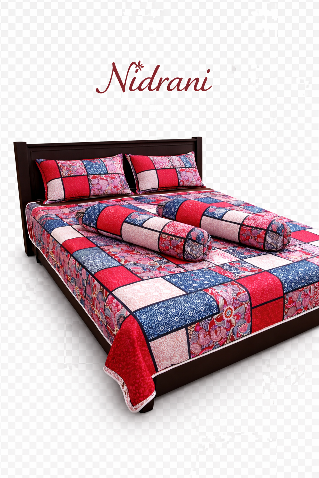 নিদ্রানী রাঙা খোপ-আল্পনা টুয়িল বেডশিট-টি তৈরি করা হয়েছে আকর্ষণীয় রাঙা লাল, গাঢ় গোলাপি, নীল ও অফ-হোয়াইট রঙের সমন্বয়ে। পুরো বেডশিটজুড়ে রয়েছে খোপধর্মী patchwork-style layout, যেখানে প্রতিটি খোপে ভিন্ন ভিন্ন আল্পনা-ধাঁচের ornamental, paisley ও floral-inspired motif ফুটে উঠেছে। এই কারণে ডিজাইনটি একই সাথে রঙিন, শৈল্পিক ও দৃষ্টিনন্দন।