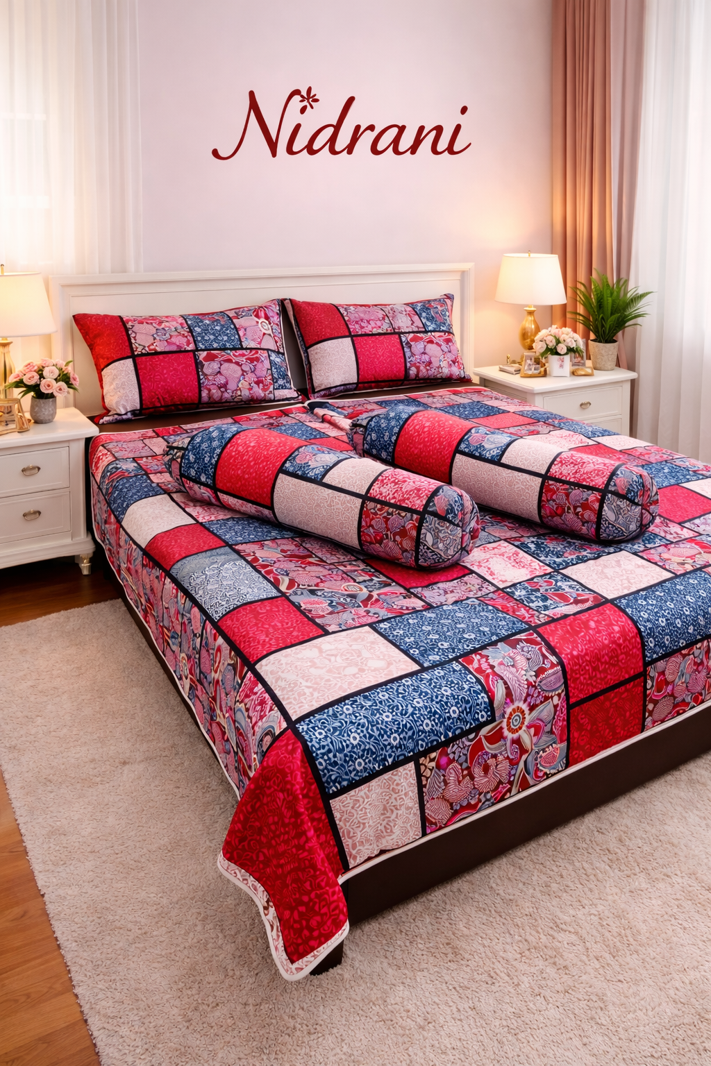 রঙের দিক থেকে এতে রক্তিম লাল, উজ্জ্বল গোলাপি, গাঢ় ও মাঝারি নীল, অফ-হোয়াইট এবং হালকা decorative shade-এর মিলন রয়েছে। এই contrast-rich color combination বেডশিটটিকে দিয়েছে একটি vibrant, festive এবং premium look। উষ্ণ লাল-গোলাপির সাথে শীতল নীলের ভারসাম্য এবং অফ-হোয়াইটের হালকা উপস্থিতি পুরো সেটকে করে তুলেছে নজরকাড়া কিন্তু সুশৃঙ্খল।