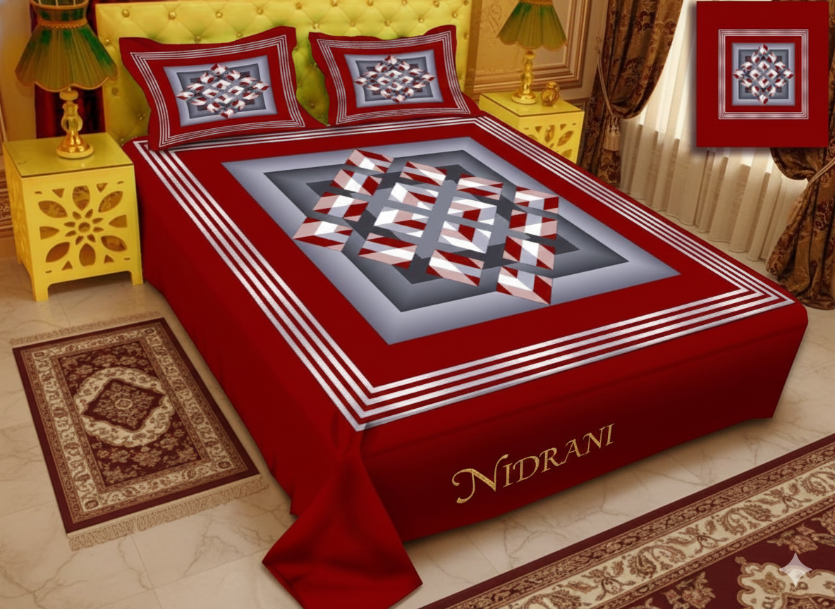 Make a bold style statement in your bedroom with the NIDRANI Luxury Geometric Panel Bedsheet. Designed for those who appreciate structured elegance and strong visual balance, this bedsheet combines modern geometry with a rich, classic red base to create a truly premium sleeping environment.